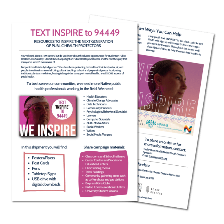 Some of the NPAIHB materials are currently “download only.” Please feel free to download and print these locally. We are excited that you are interested in these materials and apologize for any inconvenience caused at this time. We will have the print and ship option back up and running for more materials as soon as possible. If you have any questions, please reach out to NPAIHB staff at npaihb@npaihb.org and type “Native Health Resources” in the subject line, and we will respond as soon as we can.
